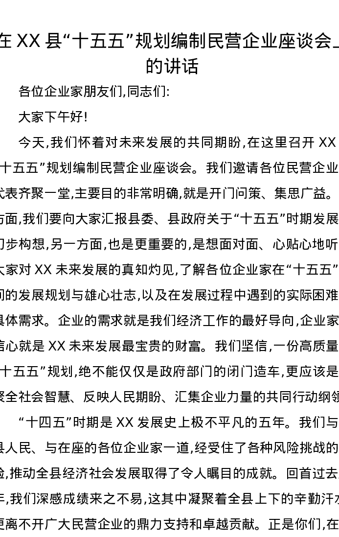 在XX县“十五五”规划编制民营企业座谈会上的讲话