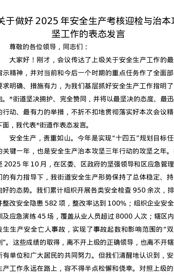 关于做好2025年安全生产考核迎检与治本攻坚工作的表态发言
