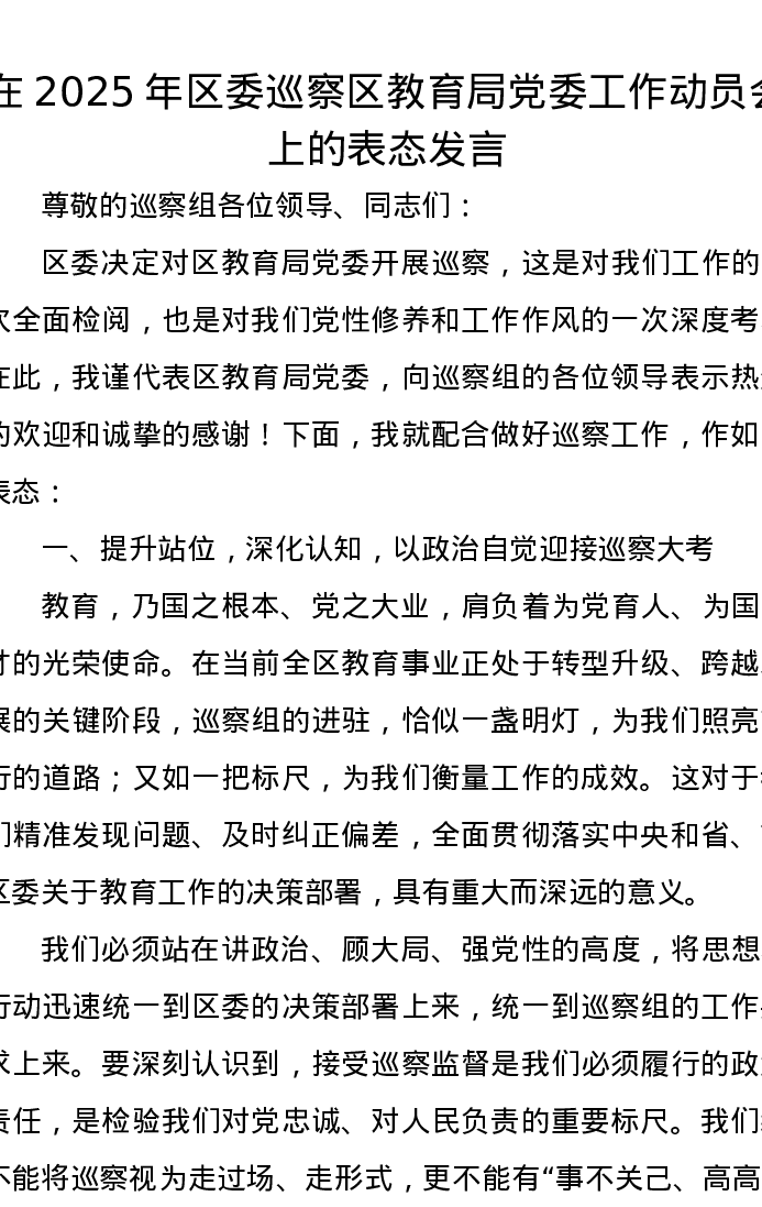 在2025年区委巡察区教育局党委工作动员会上的表态发言