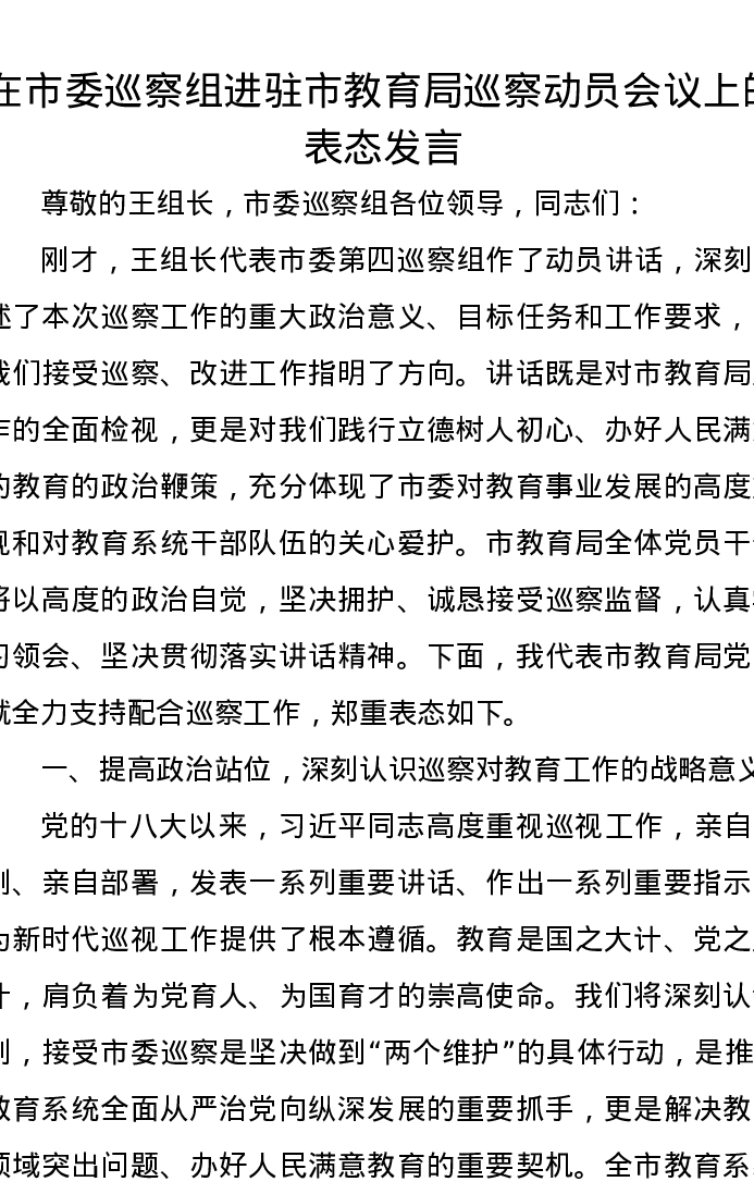 在市委巡察组进驻市教育局巡察动员会议上的表态发言