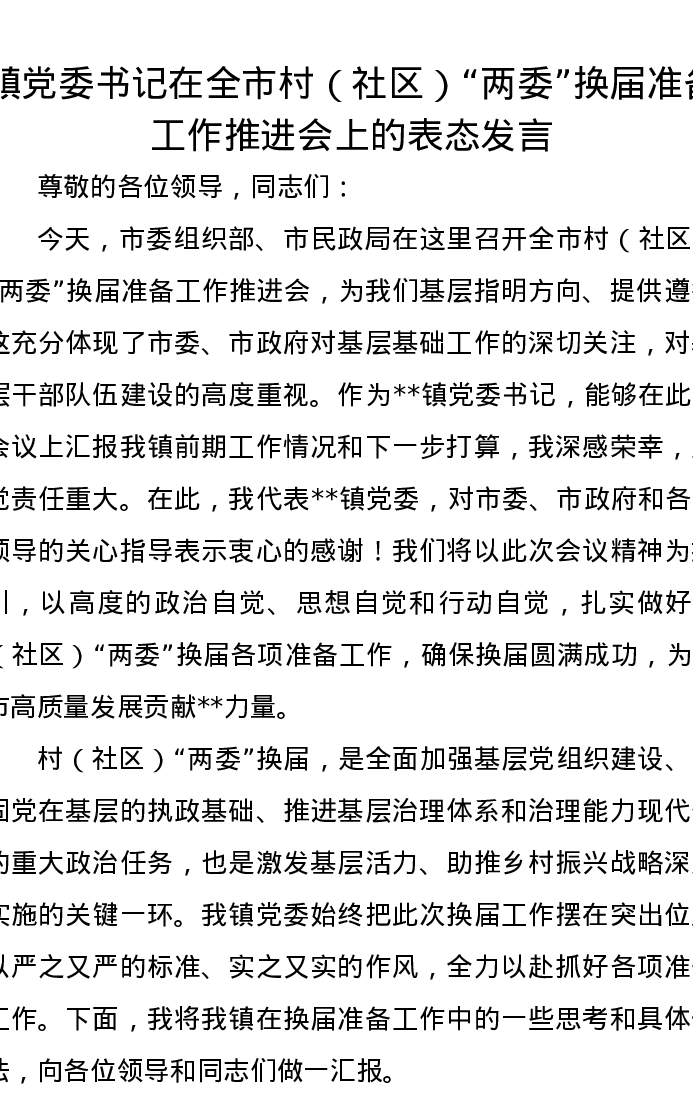 镇党委书记在全市村(社区)“两委”换届准备工作推进会上的表态发言