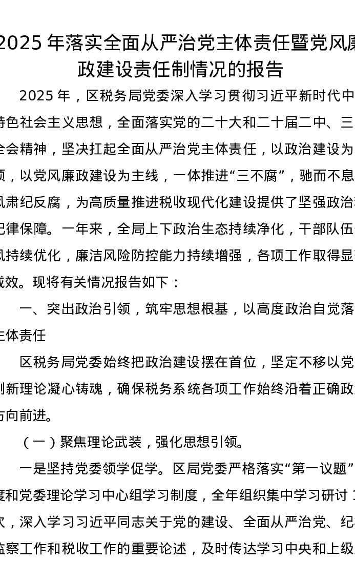 2025年落实全面从严治党主体责任暨党风廉政建设责任制情况的报告