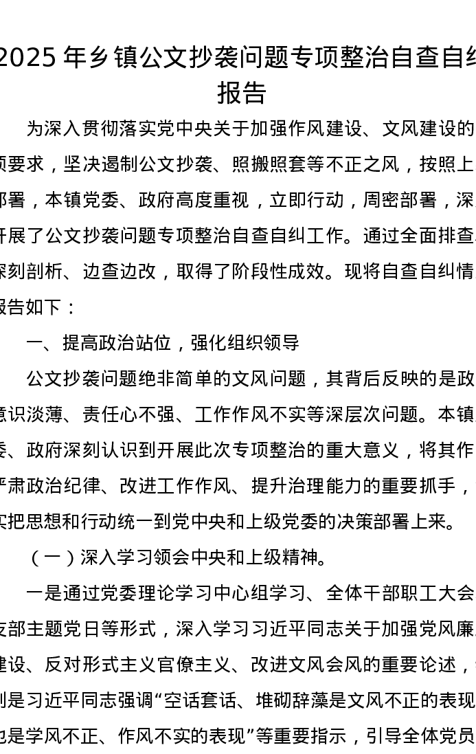 2025年乡镇公文抄袭问题专项整治自查自纠报告