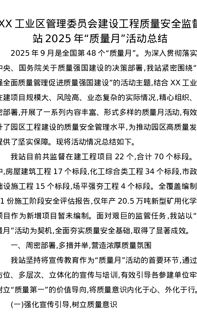 XX工业区管理委员会建设工程质量安全监督站2025年“质量月”活动总结
