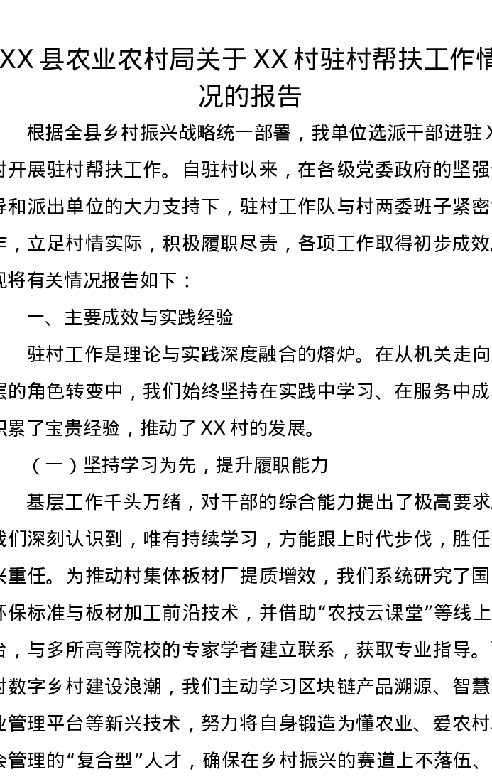XX县农业农村局关于XX村驻村帮扶工作情况的报告