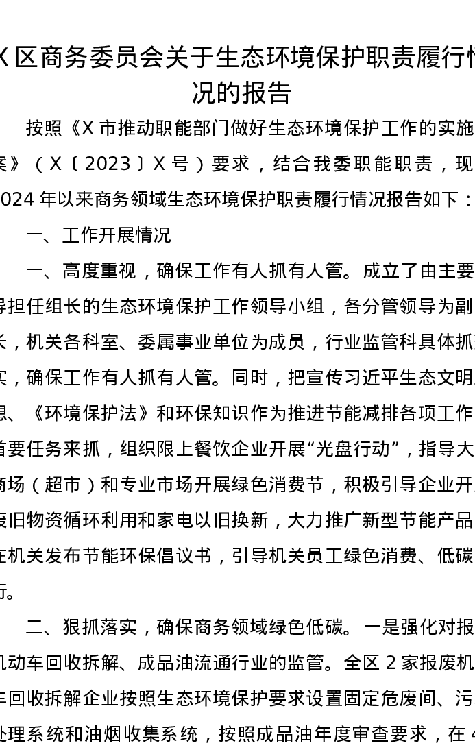 X区商务委员会关于生态环境保护职责履行情况的报告