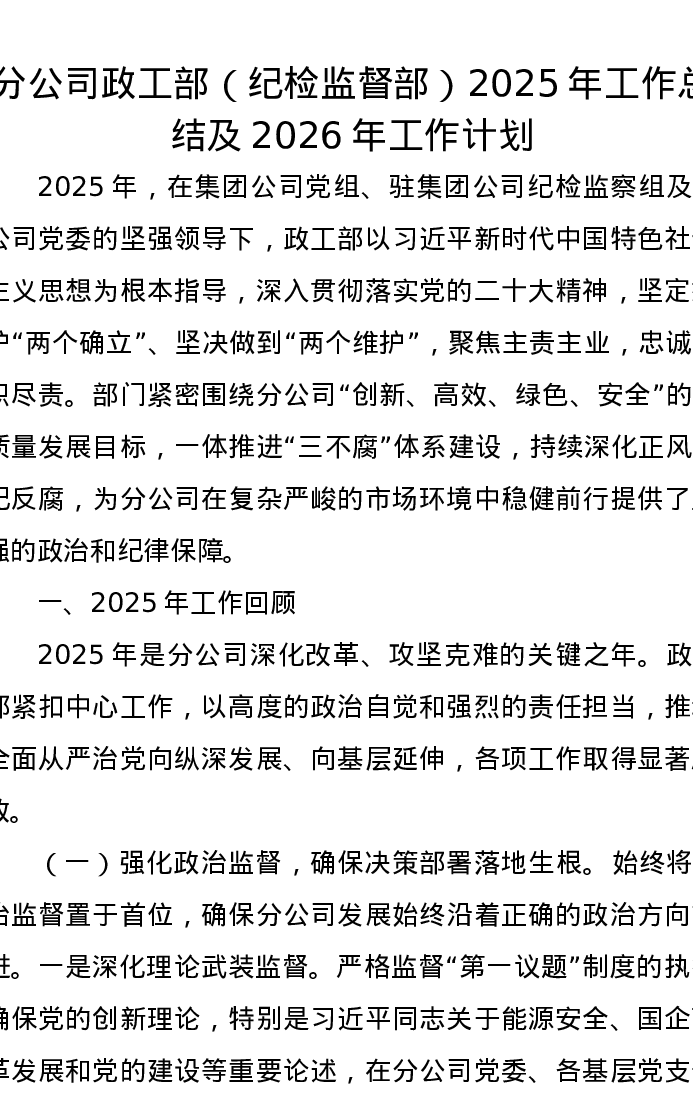分公司政工部(纪检监督部)2025年工作总结及2026年工作计划