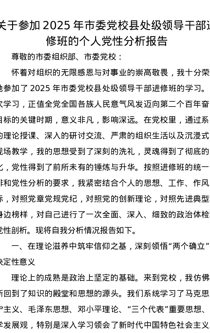 关于参加2025年市委党校县处级领导干部进修班的个人党性分析报告
