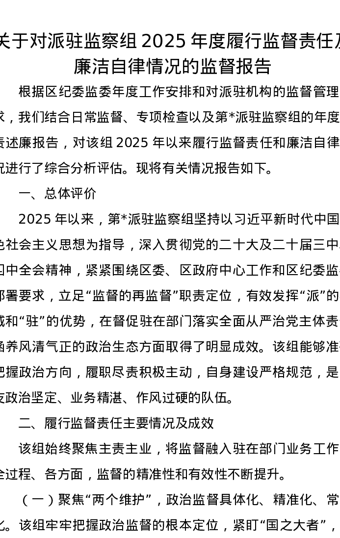 关于对派驻监察组2025年度履行监督责任及廉洁自律情况的监督报告