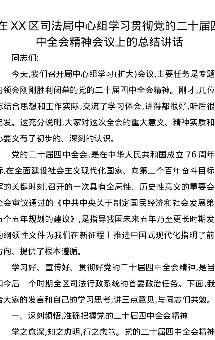 在XX区司法局中心组学习贯彻党的二十届四中全会精神会议上的总结讲话