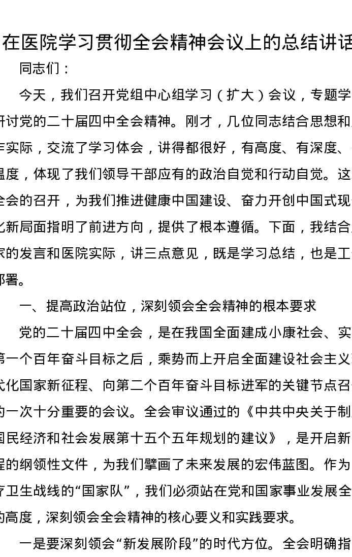 在医院学习贯彻四中全会精神会议上的总结讲话
