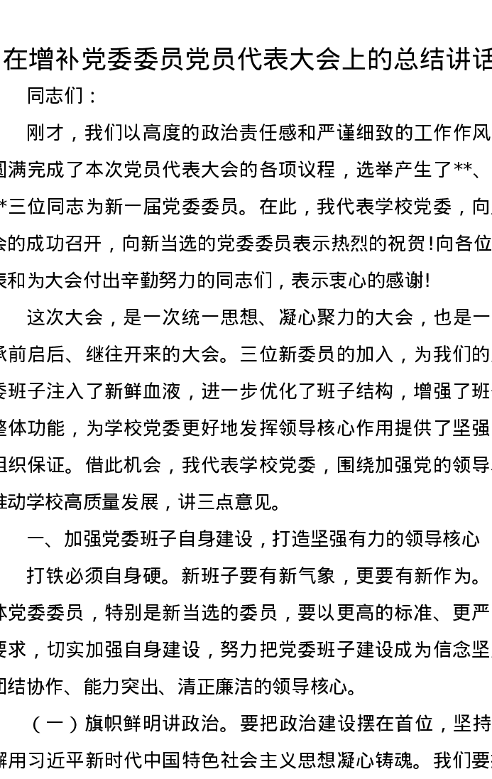 在增补党委委员党员代表大会上的总结讲话