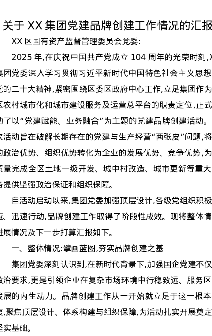 关于XX集团党建品牌创建工作情况的汇报