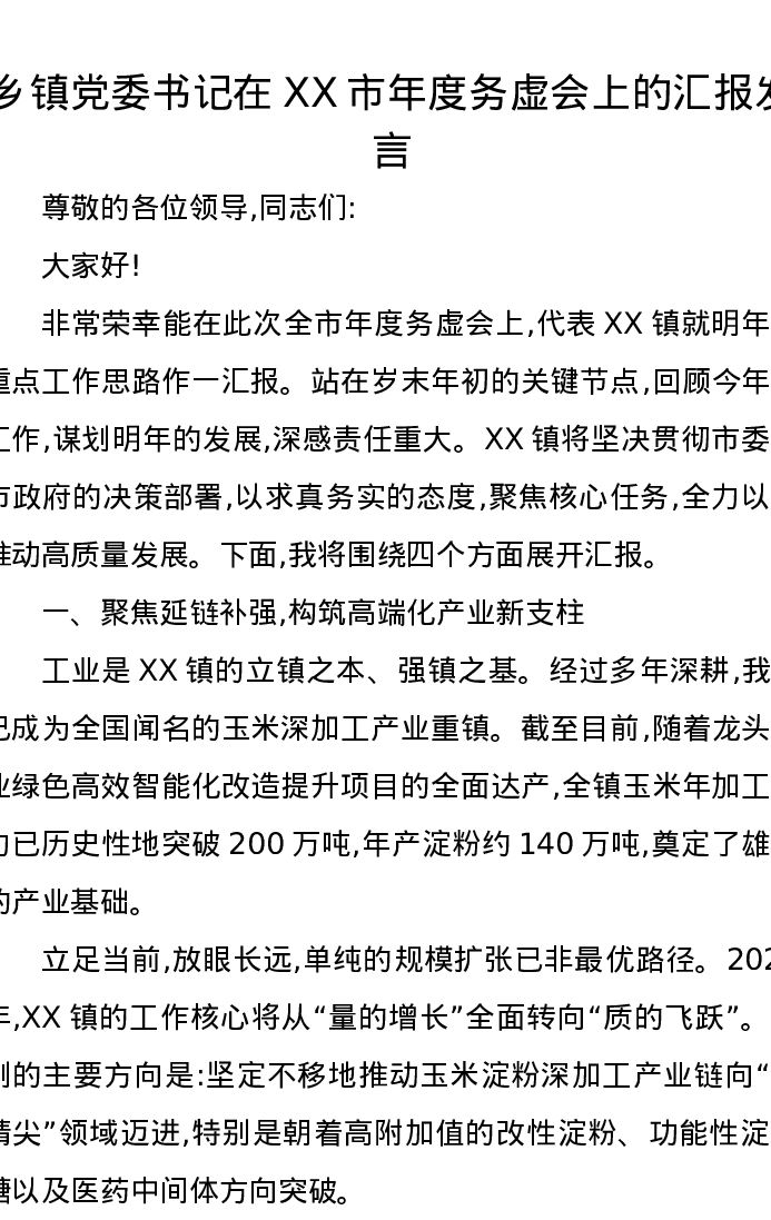乡镇党委书记在XX市年度务虚会上的汇报发言