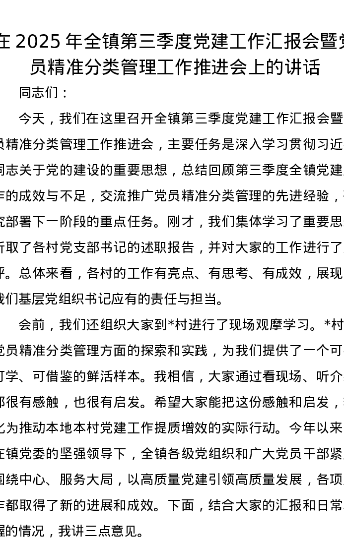 在2025年全镇第三季度党建工作汇报会暨党员精准分类管理工作推进会上的讲话