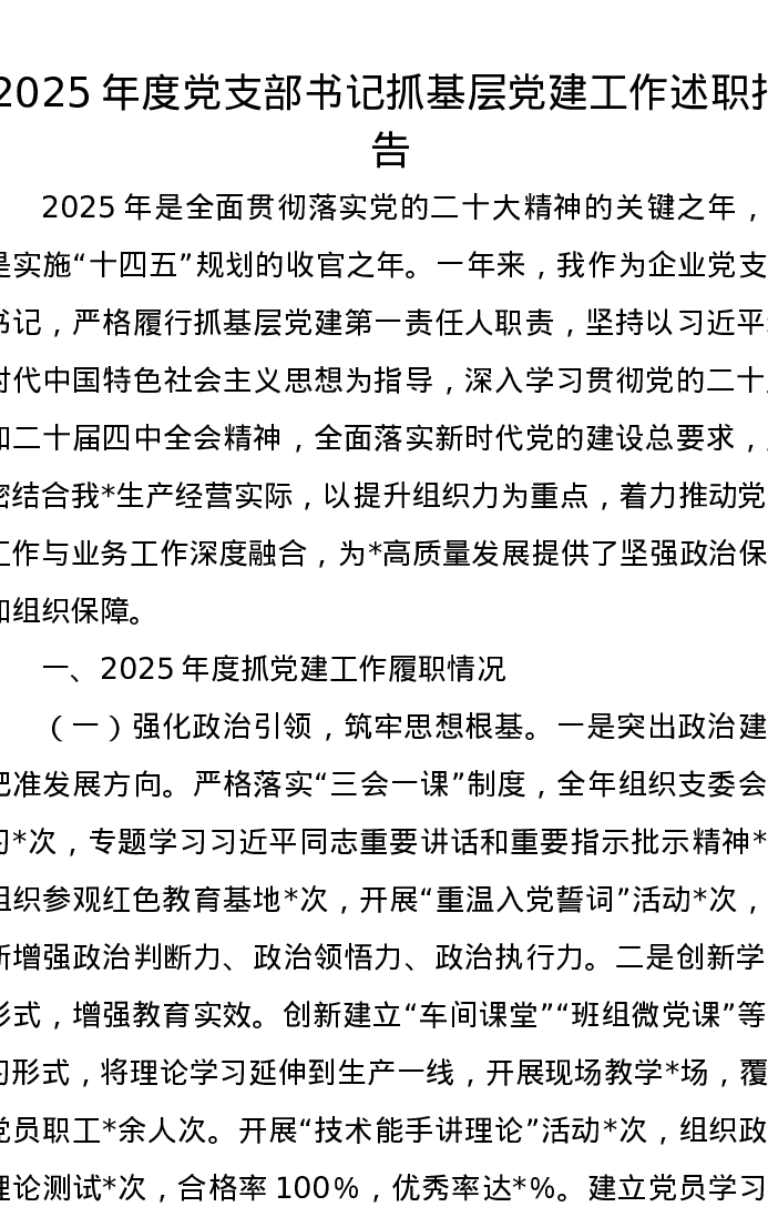 2025年度党支部书记抓基层党建工作述职报告