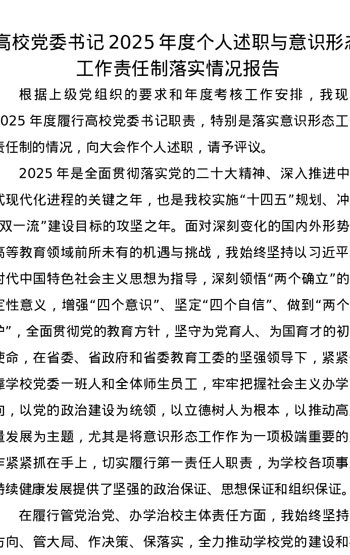高校党委书记2025年度个人述职与意识形态工作责任制落实情况报告
