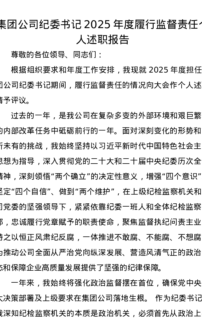 集团公司纪委书记2025年度履行监督责任个人述职报告