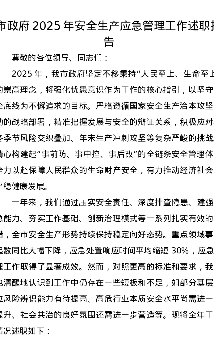 市政府2025年安全生产应急管理工作述职报告