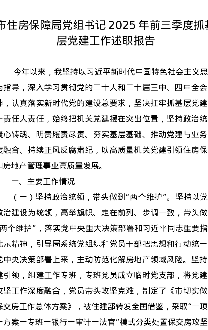 市住房保障局党组书记2025年前三季度抓基层党建工作述职报告