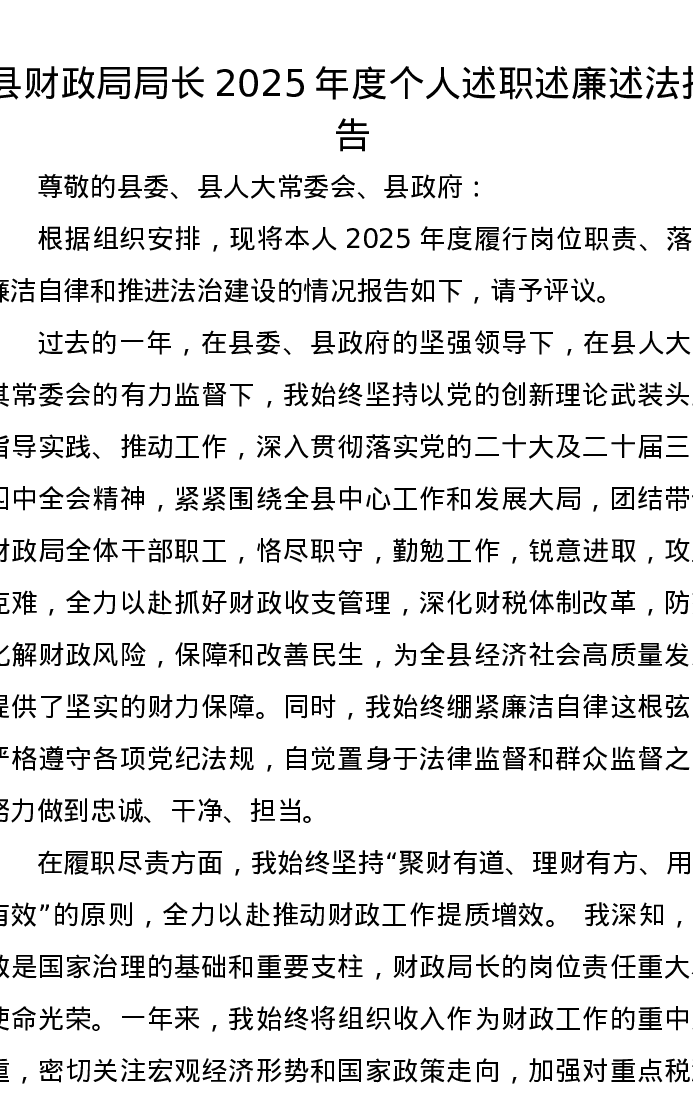 县财政局局长2025年度个人述职述廉述法报告
