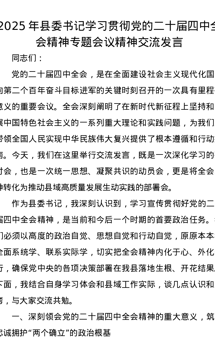 2025年县委书记学习贯彻党的二十届四中全会精神专题会议精神交流发言