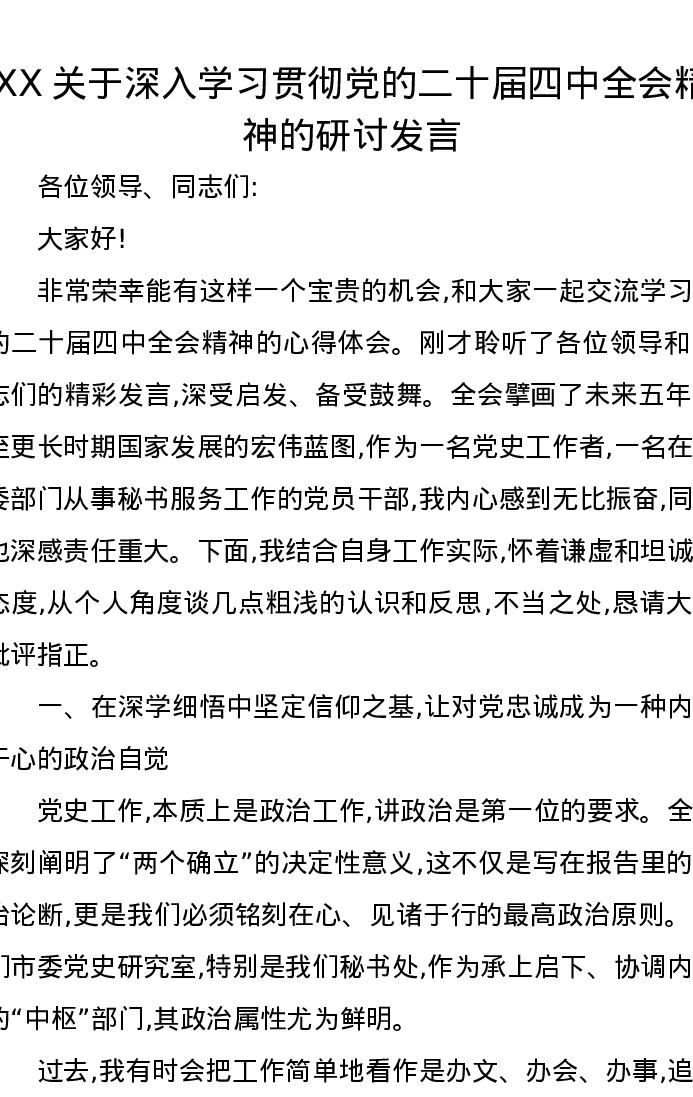 XX关于深入学习贯彻党的二十届四中全会精神的研讨发言