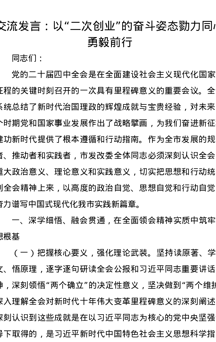 交流发言:以“二次创业”的奋斗姿态勠力同心、勇毅前行