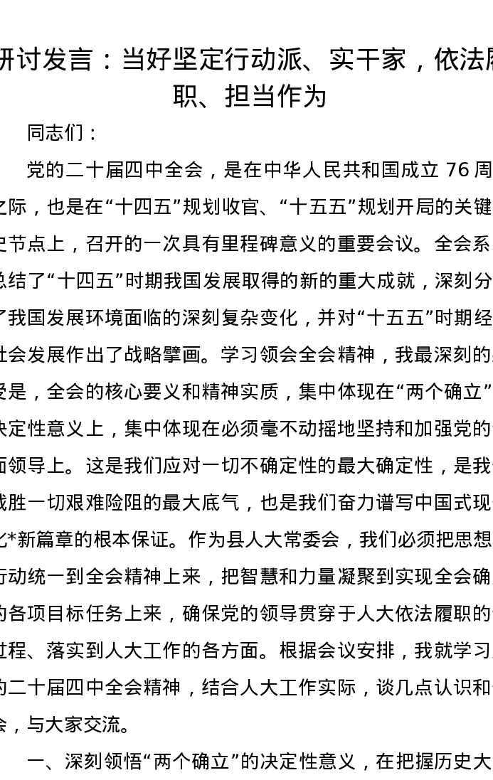 研讨发言:当好坚定行动派、实干家,依法履职、担当作为