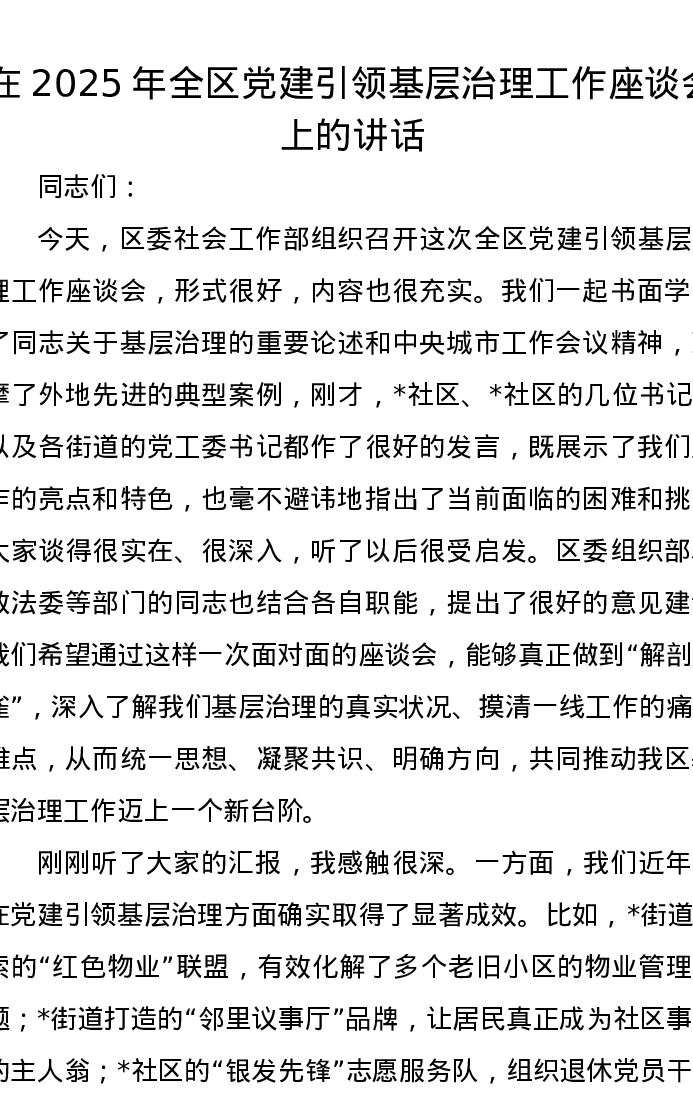 在2025年全区党建引领基层治理工作座谈会上的讲话