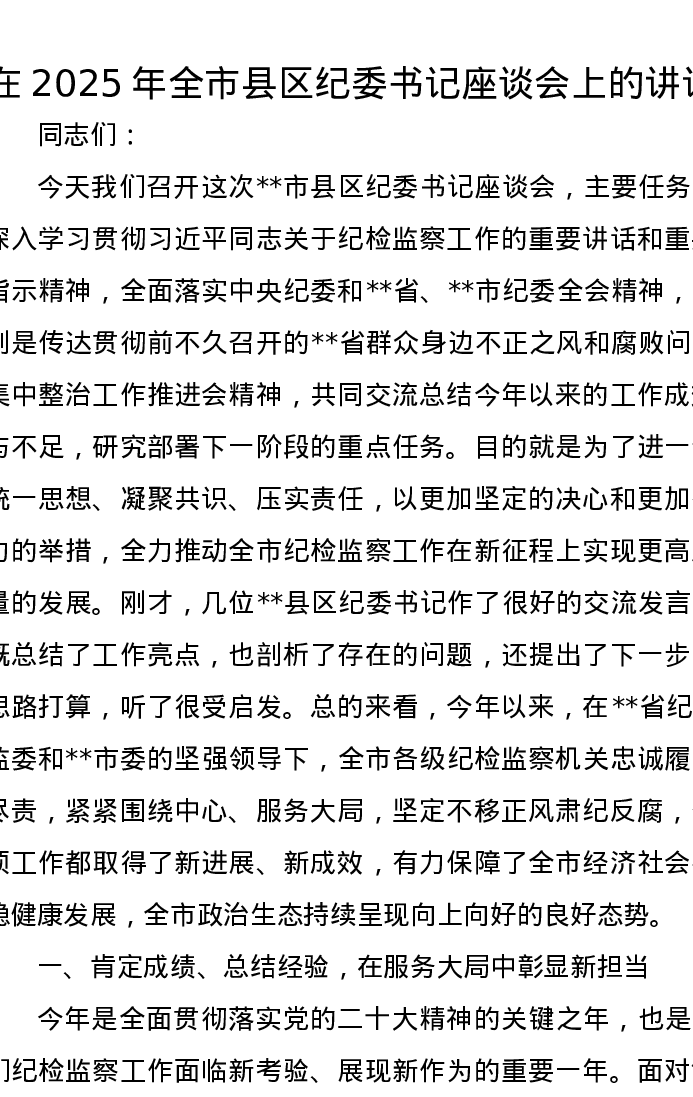 在2025年全市县区纪委书记座谈会上的讲话