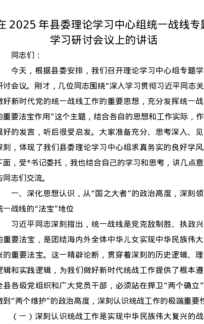 在2025年县委理论学习中心组统一战线专题学习研讨会议上的讲话