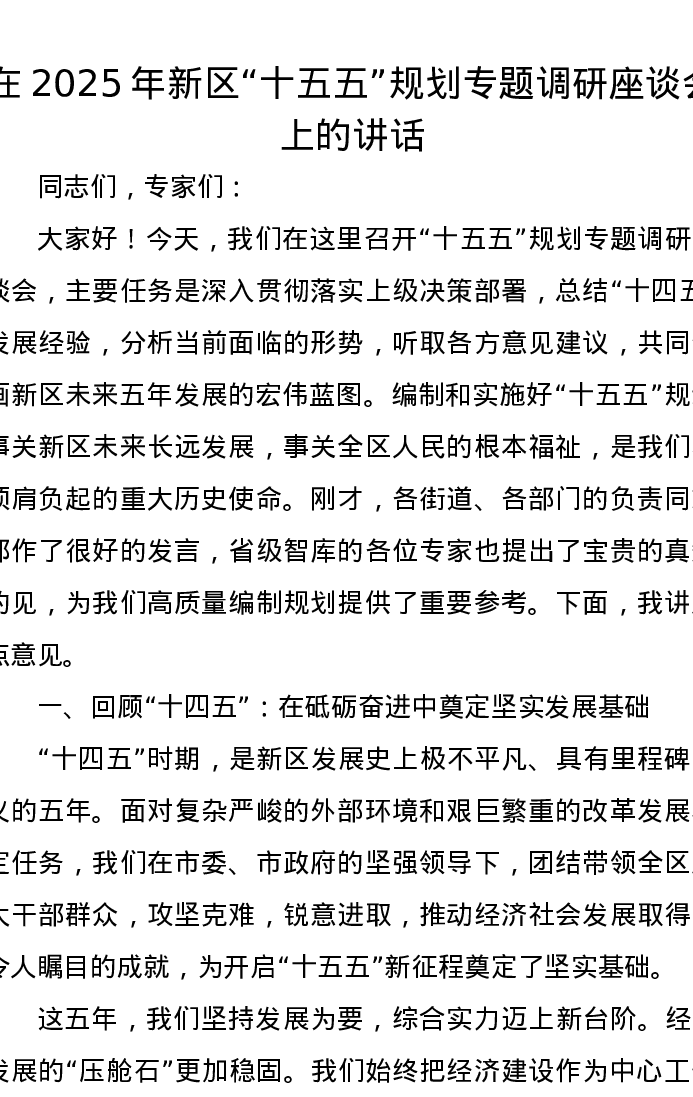在2025年新区“十五五”规划专题调研座谈会上的讲话