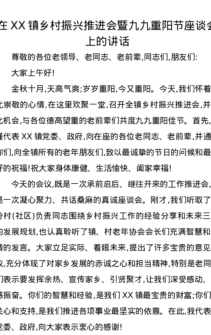 在XX镇乡村振兴推进会暨九九重阳节座谈会上的讲话