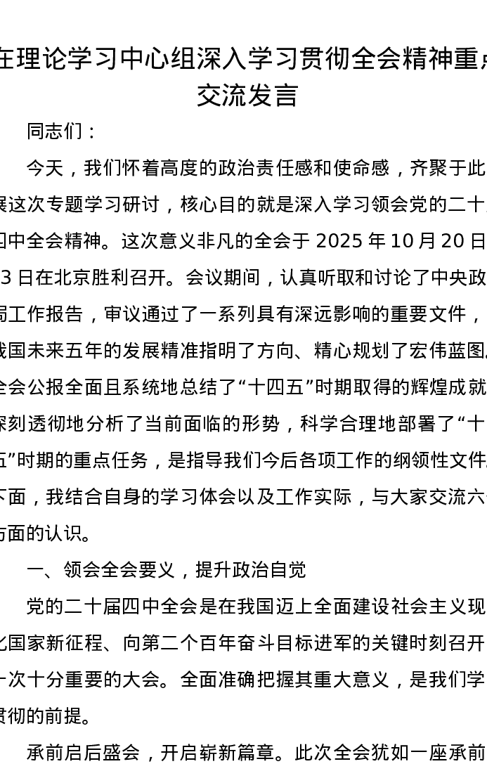 在理论学习中心组深入学习贯彻二十届四中全会精神重点交流发言