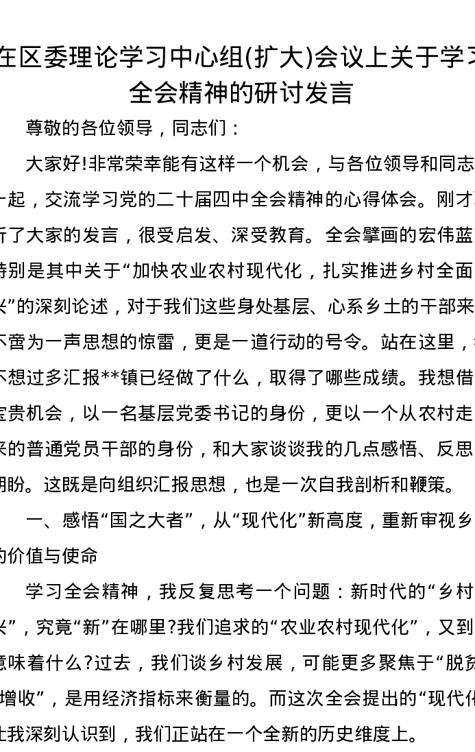 在区委理论学习中心组(扩大)会议上关于学习全会精神的研讨发言