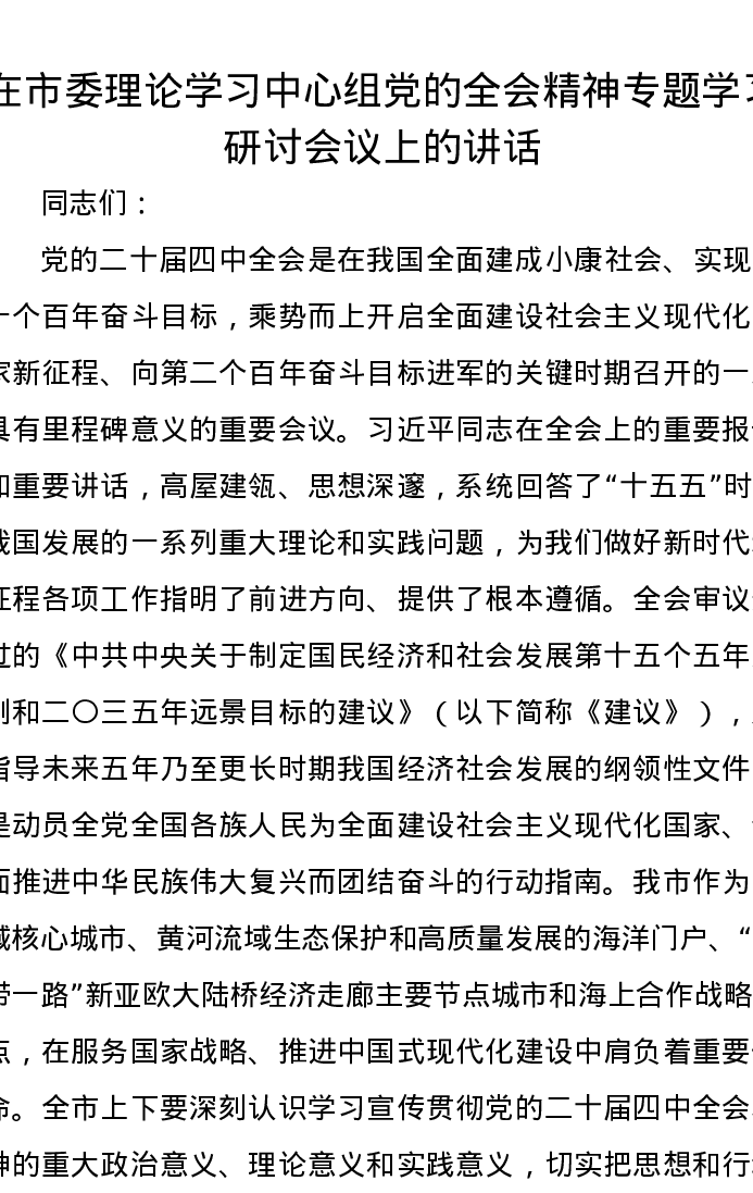 在市委理论学习中心组党的二十届四中全会精神专题学习研讨会议上的讲话