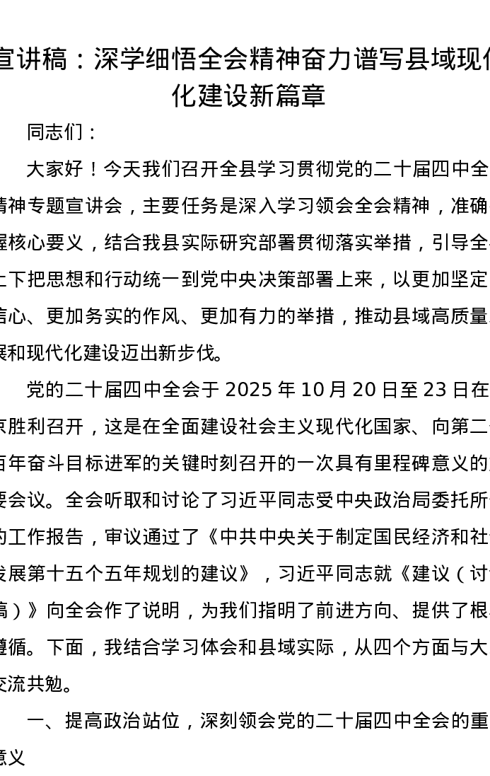 宣讲稿:深学细悟二十届四中全会精神 奋力谱写县域现代化建设新篇章