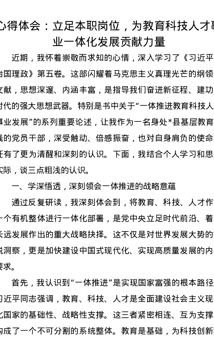 心得体会:立足本职岗位,为教育科技人才事业一体化发展贡献力量