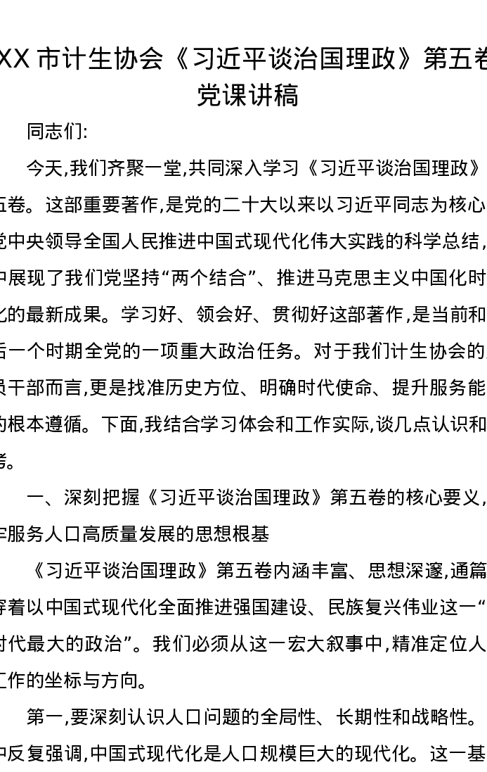 XX市计生协会《习近平谈治国理政》第五卷党课讲稿