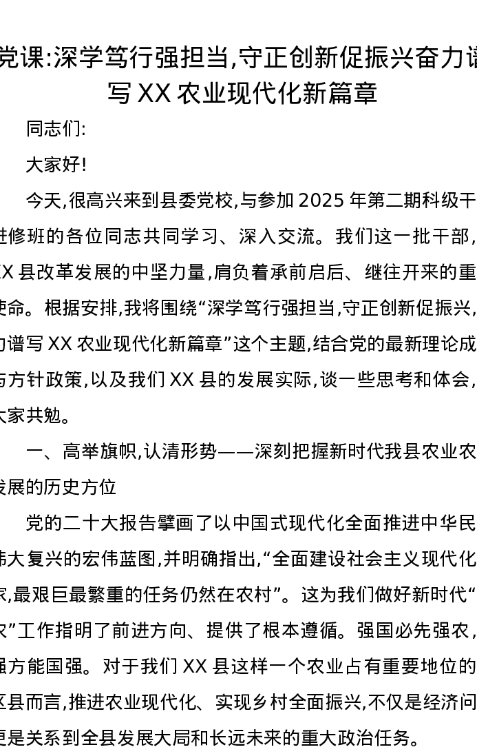党课讲稿:深学笃行强担当,守正创新促振兴奋力谱写XX农业现代化新篇章