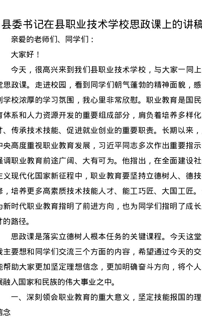 县委书记在县职业技术学校思政课上的讲稿