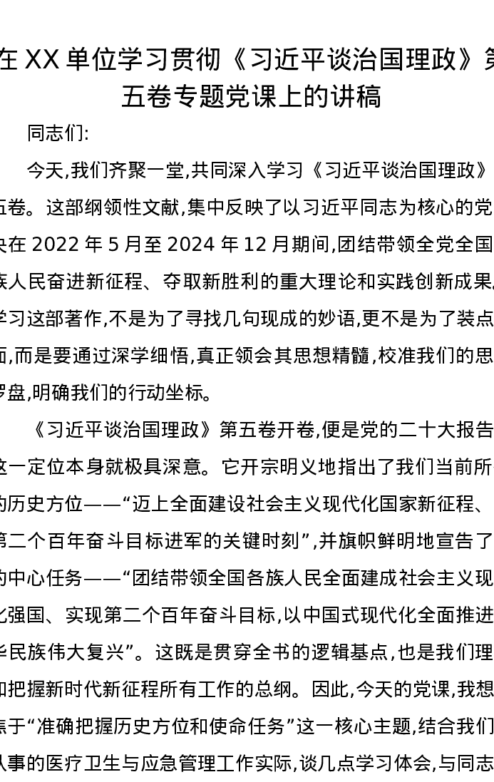 在XX单位学习贯彻《习近平谈治国理政》第五卷专题党课上的讲稿
