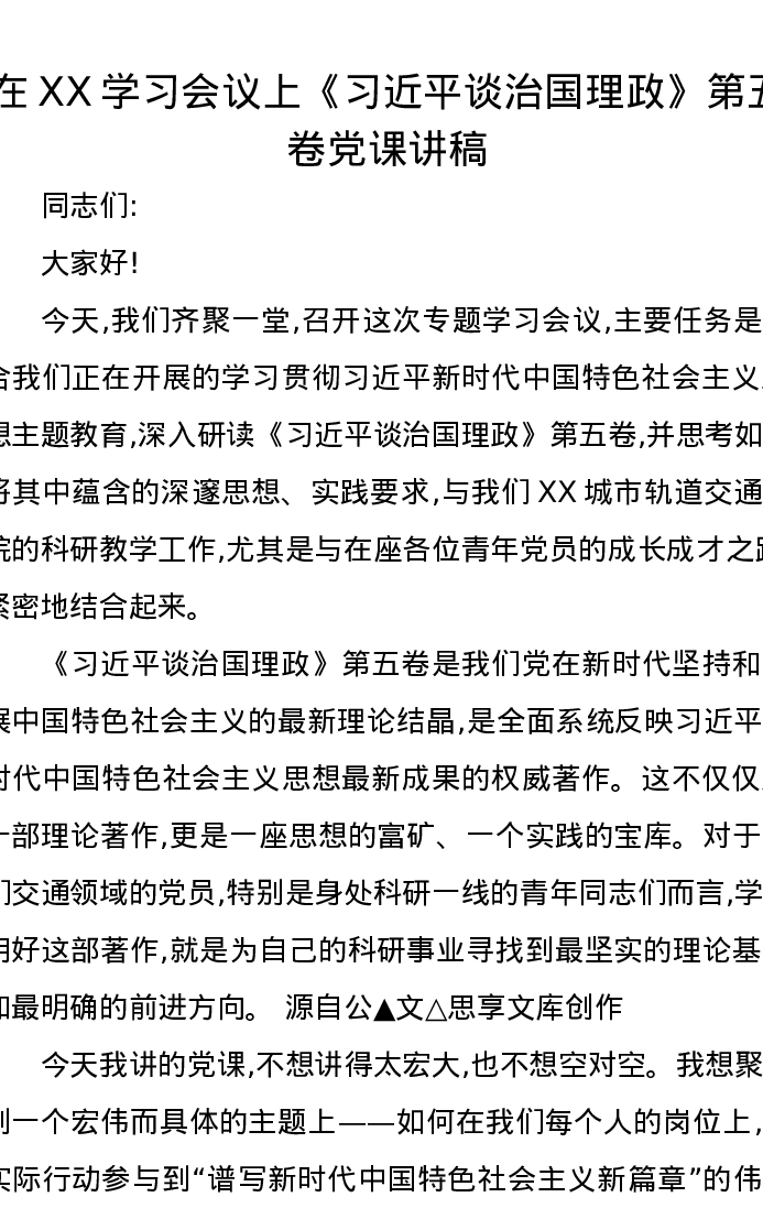 在XX学习会议上《习近平谈治国理政》第五卷党课讲稿