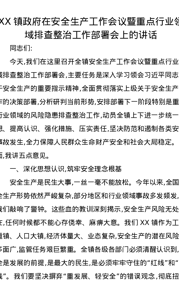XX镇政府在安全生产工作会议暨重点行业领域排查整治工作部署会上的讲话