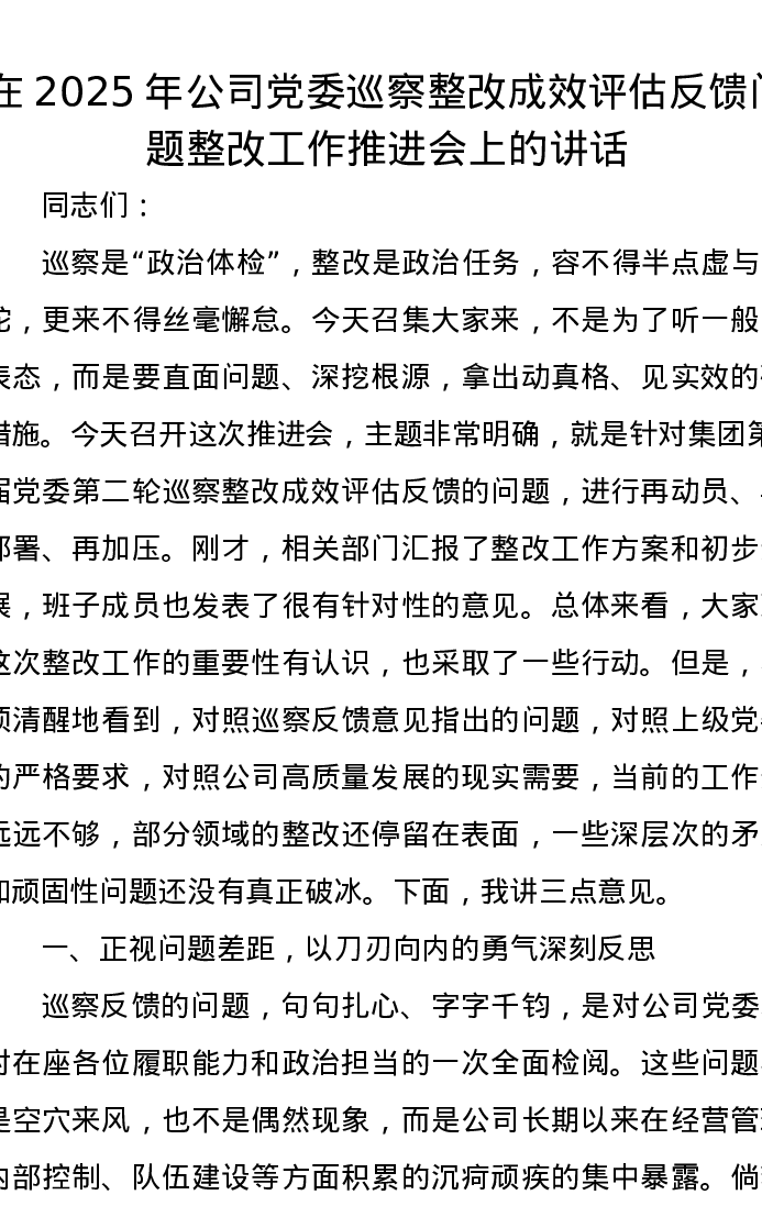 在2025年公司党委巡察整改成效评估反馈问题整改工作推进会上的讲话