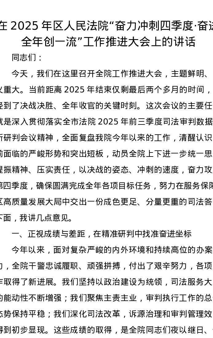 在2025年区人民法院“奋力冲刺四季度·奋进全年创一流”工作推进大会上的讲话