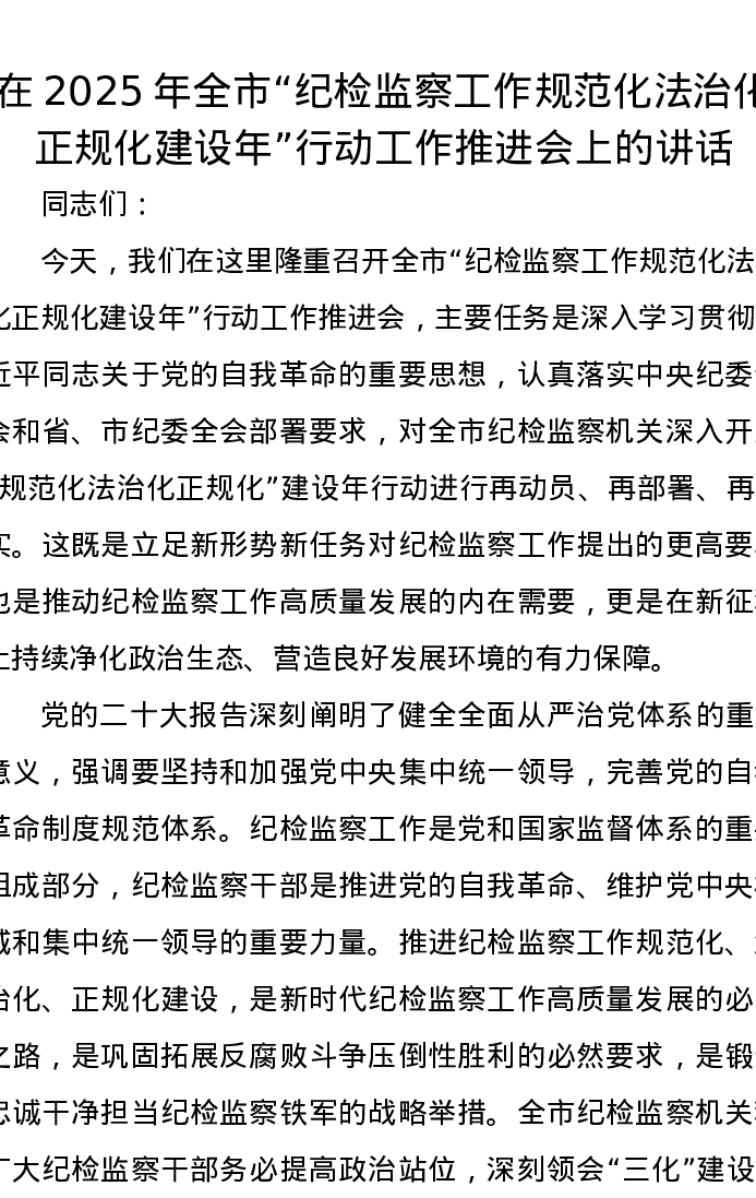 在2025年全市“纪检监察工作规范化法治化正规化建设年”行动工作推进会上的讲话