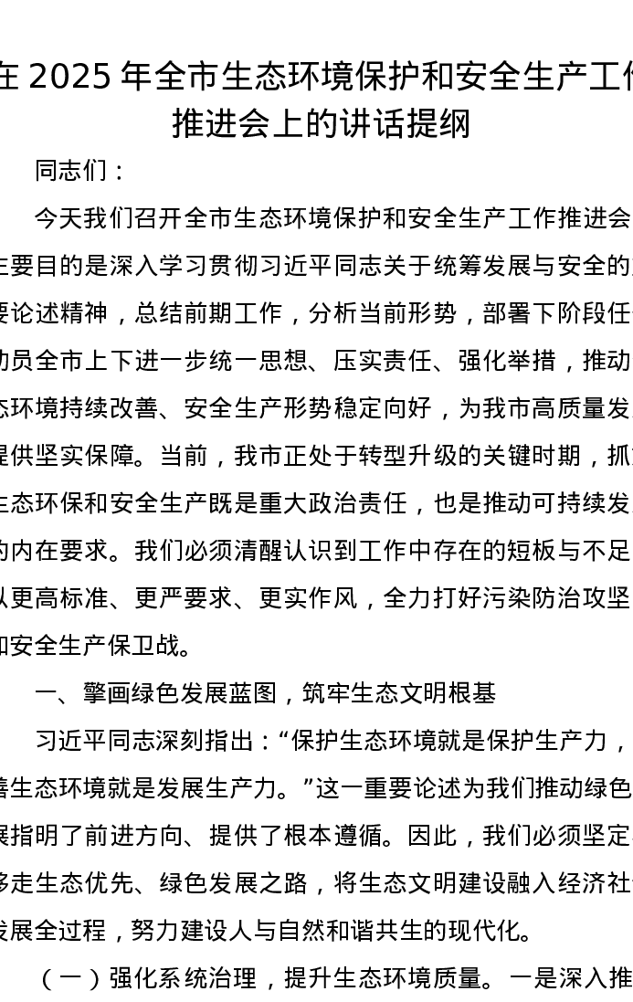 在2025年全市生态环境保护和安全生产工作推进会上的讲话提纲
