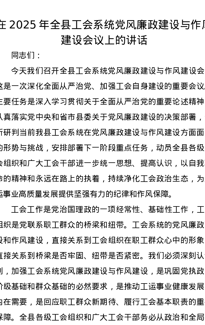 在2025年全县工会系统党风廉政建设与作风建设会议上的讲话